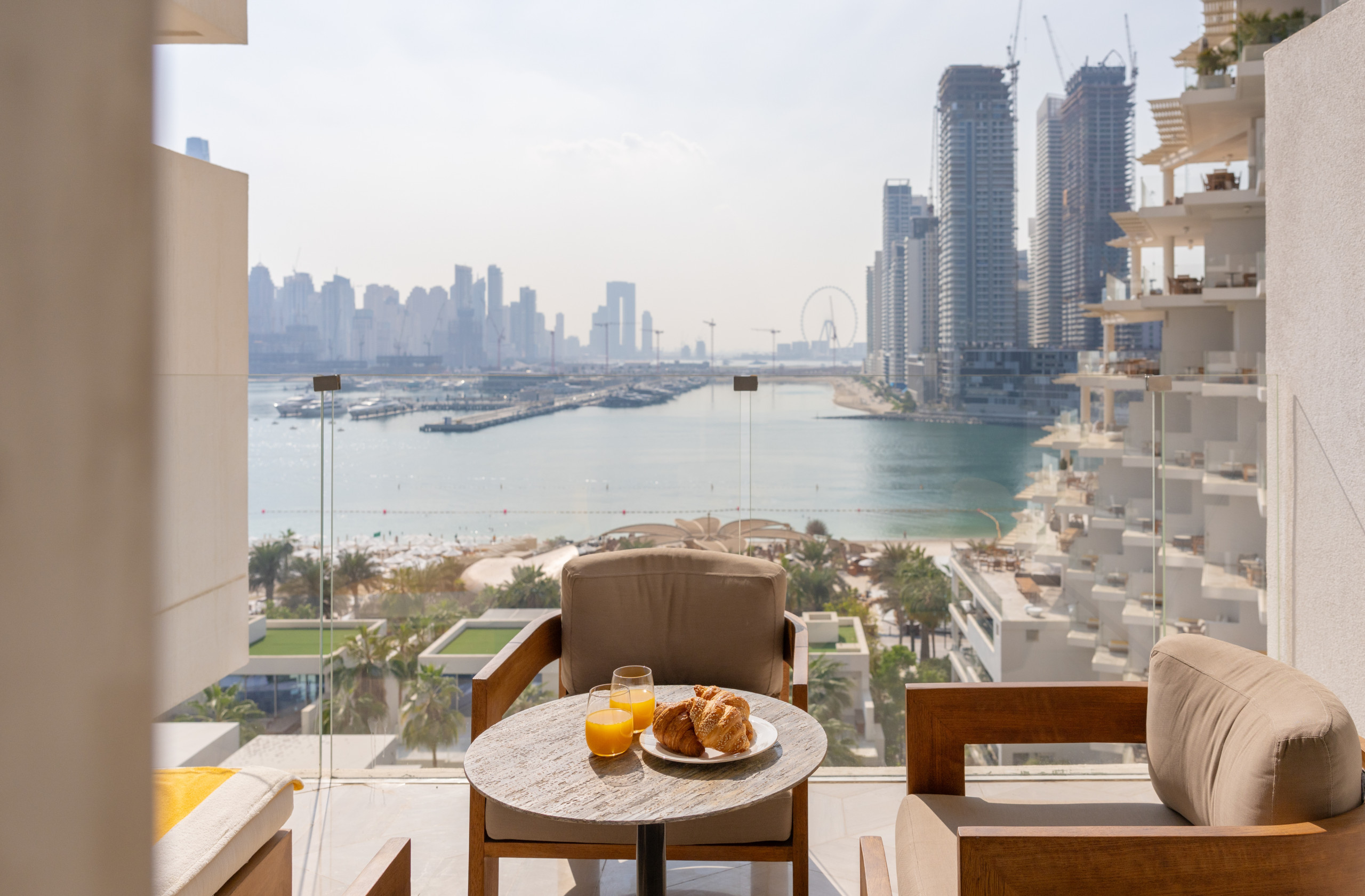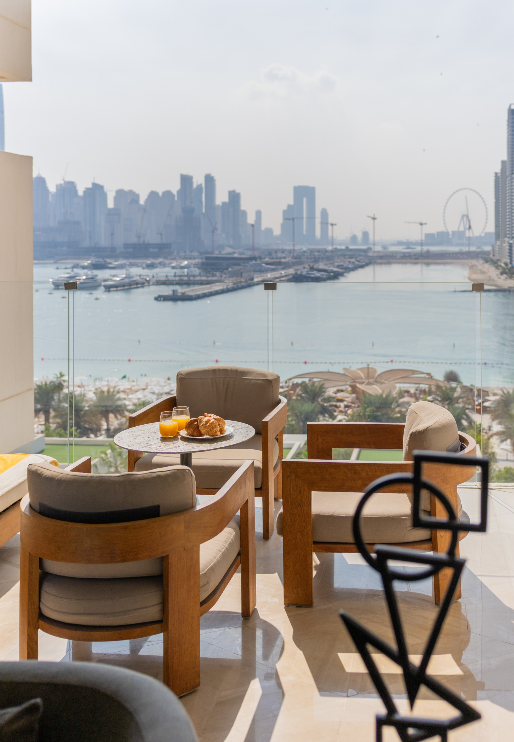 The lounge area also has a nice balcony where you’ll enjoy relaxing on the sunbed with a marvelous view of the sea and Dubai eye.