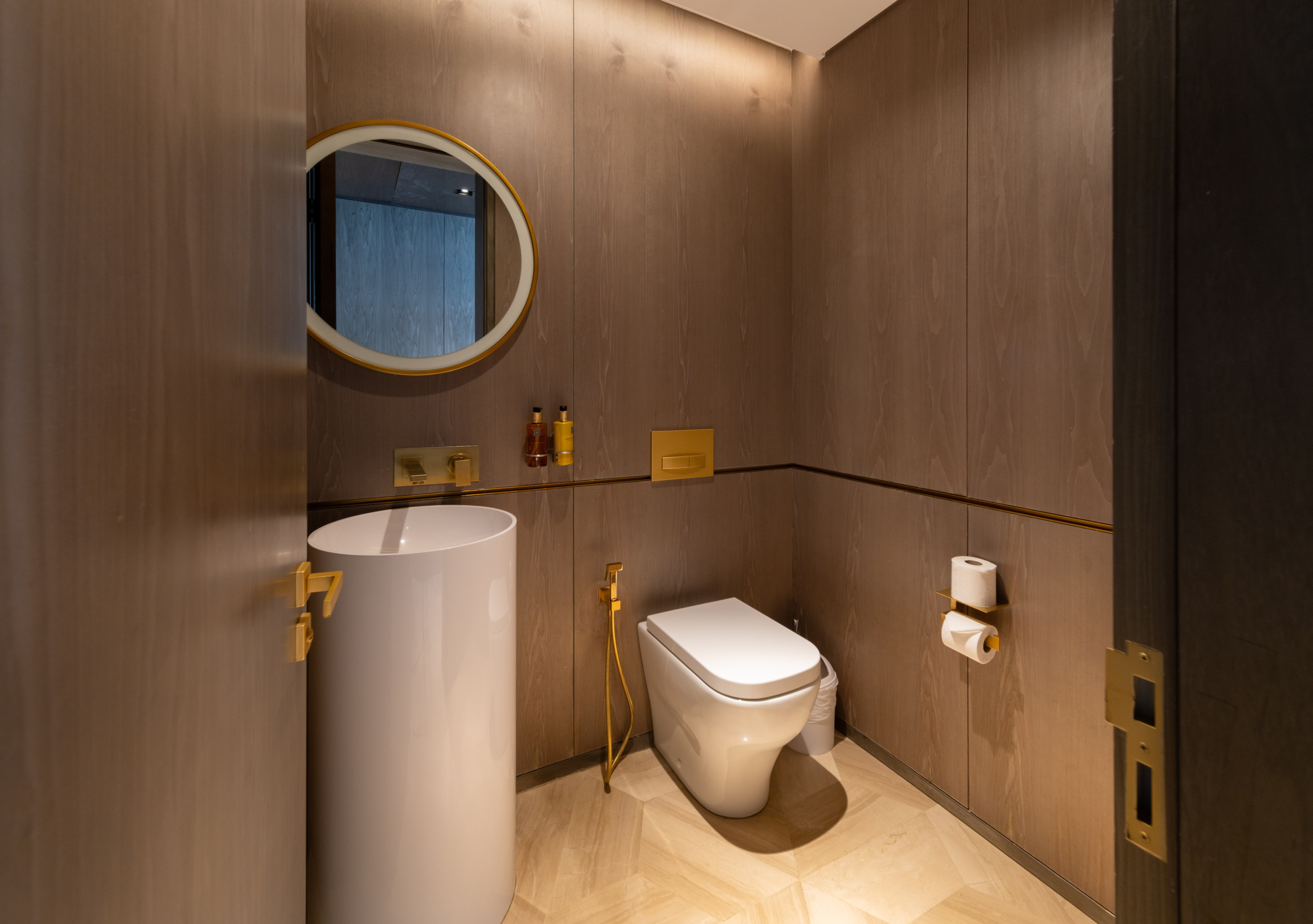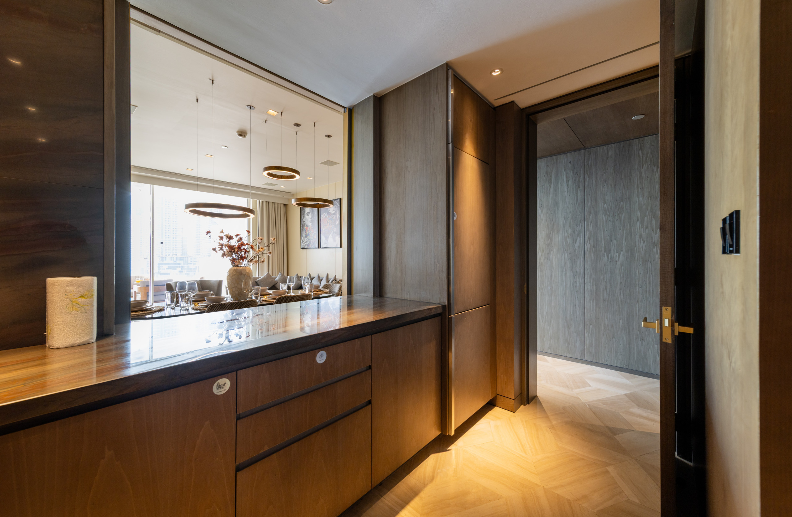 The Dining area is situated next to a classy and spacious Semi-American-style kitchen, which is fully loaded with essential kitchen appliances such as a coffee machine, a toaster and a kettle for your convenience.