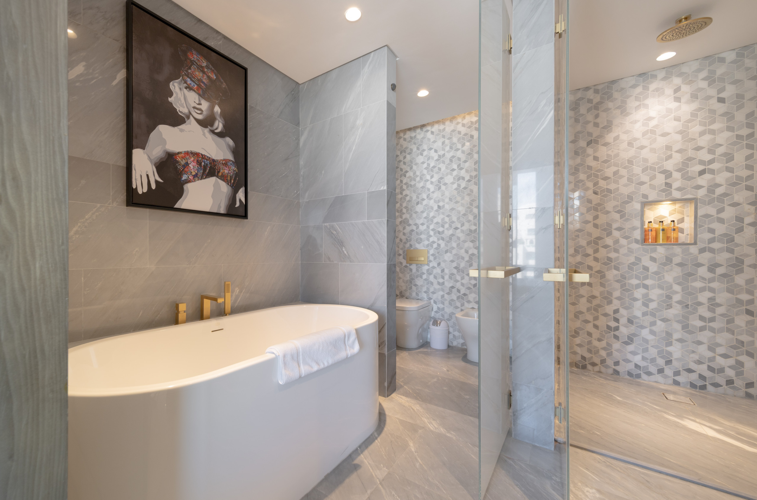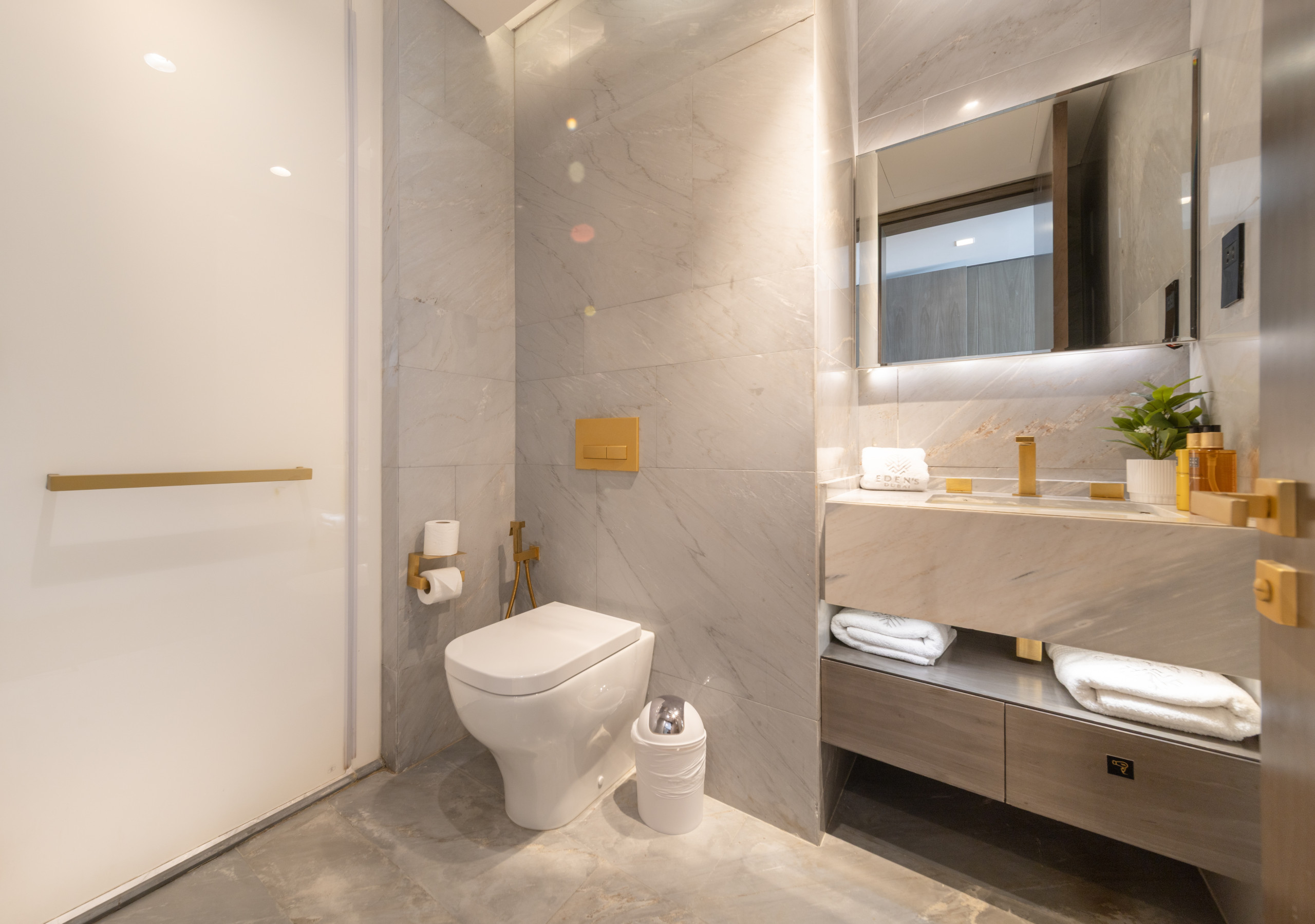 The balcony features a stunning Marina view, where you’ll be able to enjoy watching a breathtaking view during the sunset from the comfort of your own bed and the en-suite bathroom with premium finishings features a bathtub, a toilet and a sink.