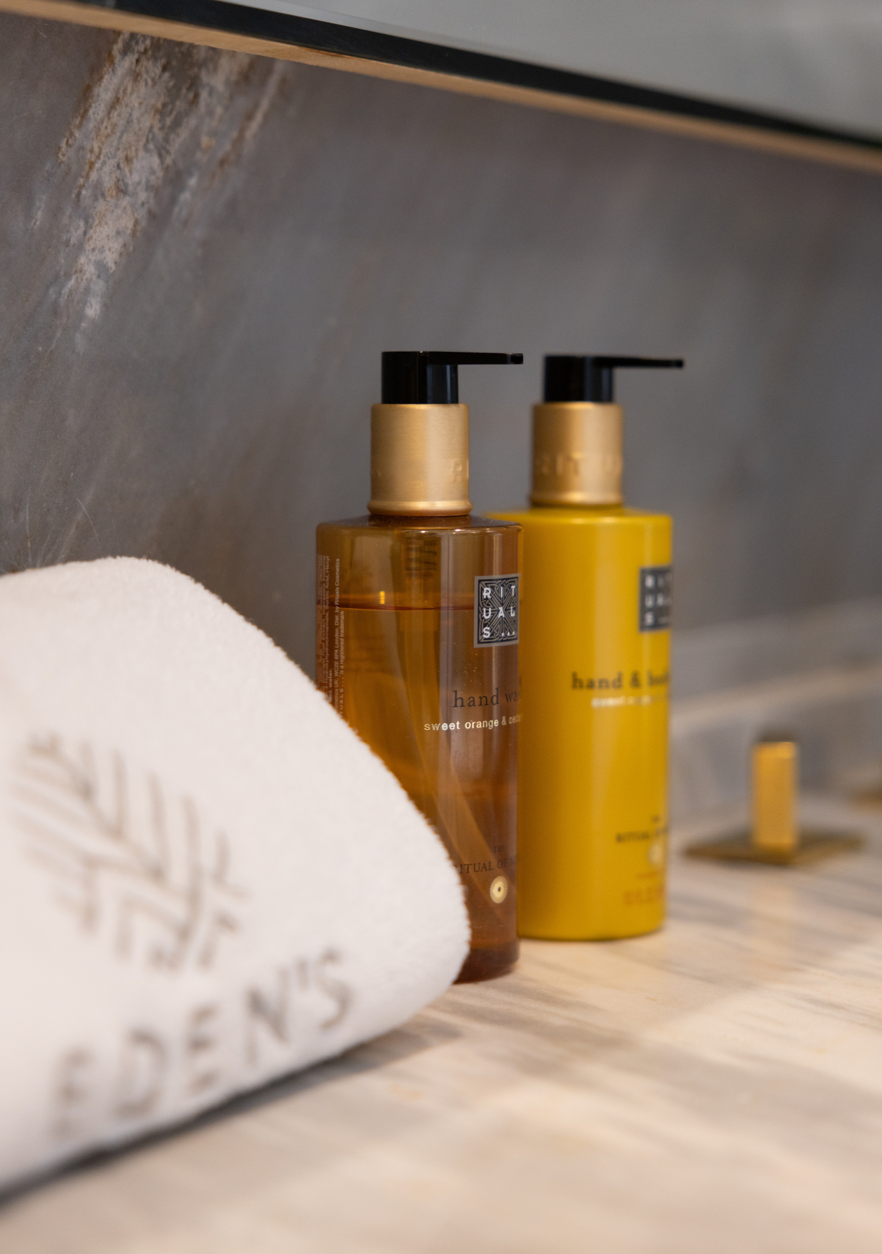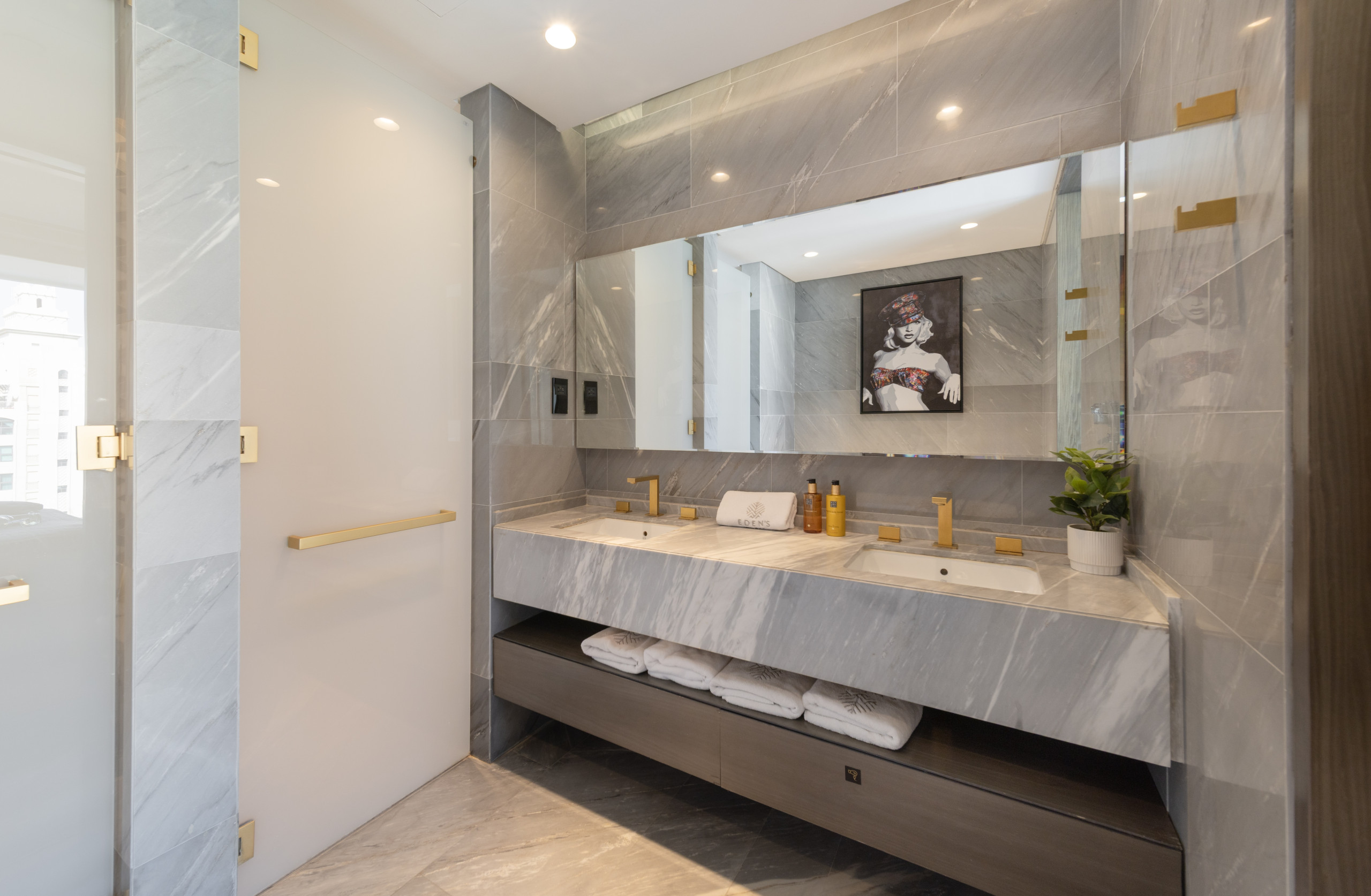 An en-suite bathroom features a walk-in shower unit with rainfall facilities, a toilet and double basins. The bathroom is fully loaded with towels and premium amenities for your stay.