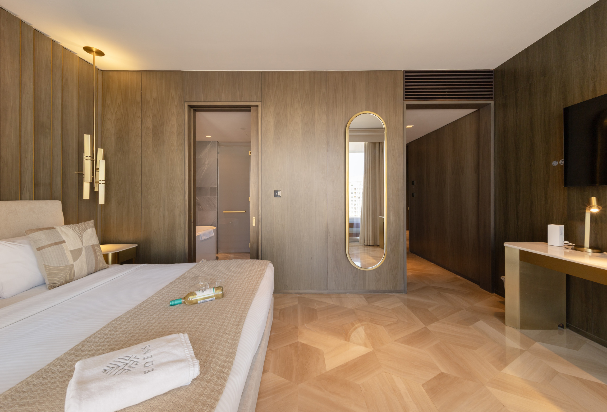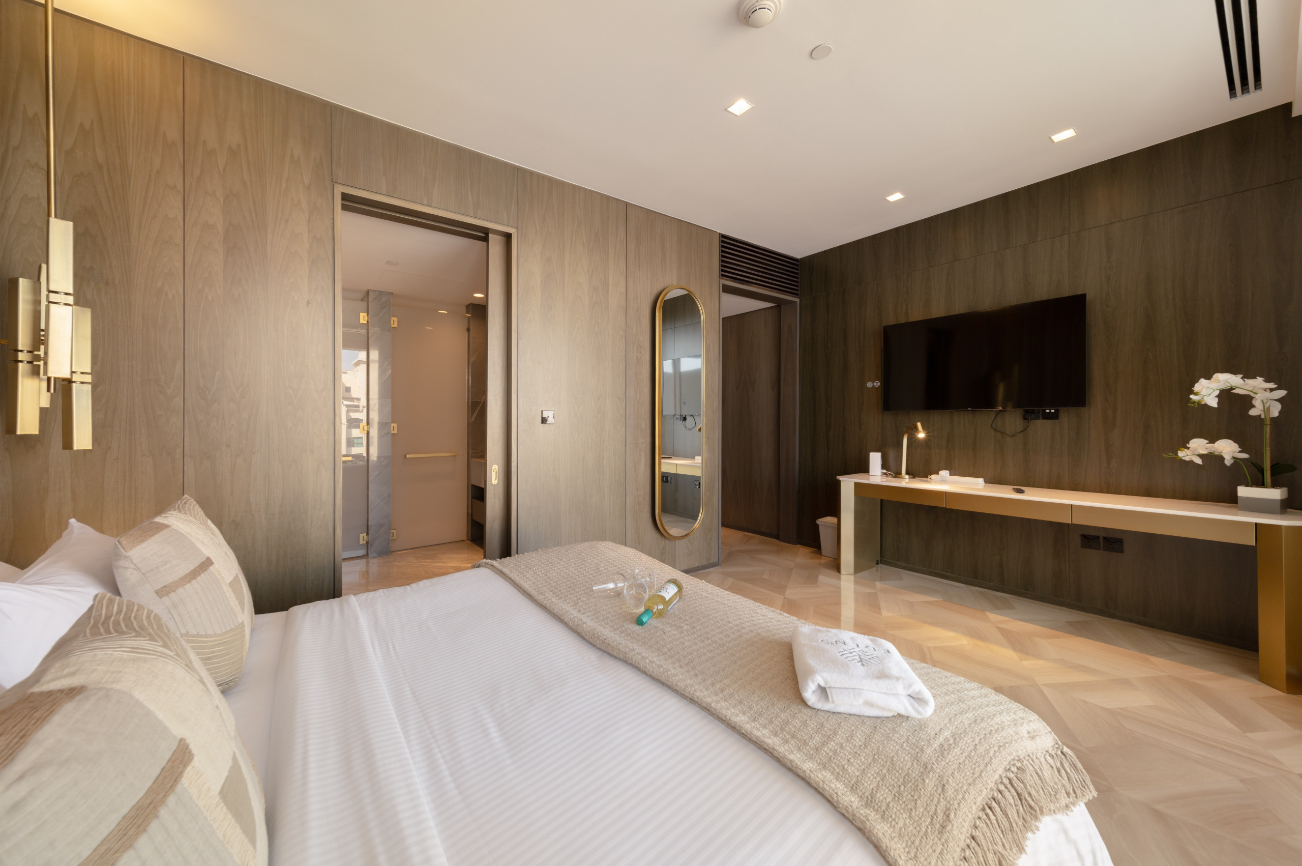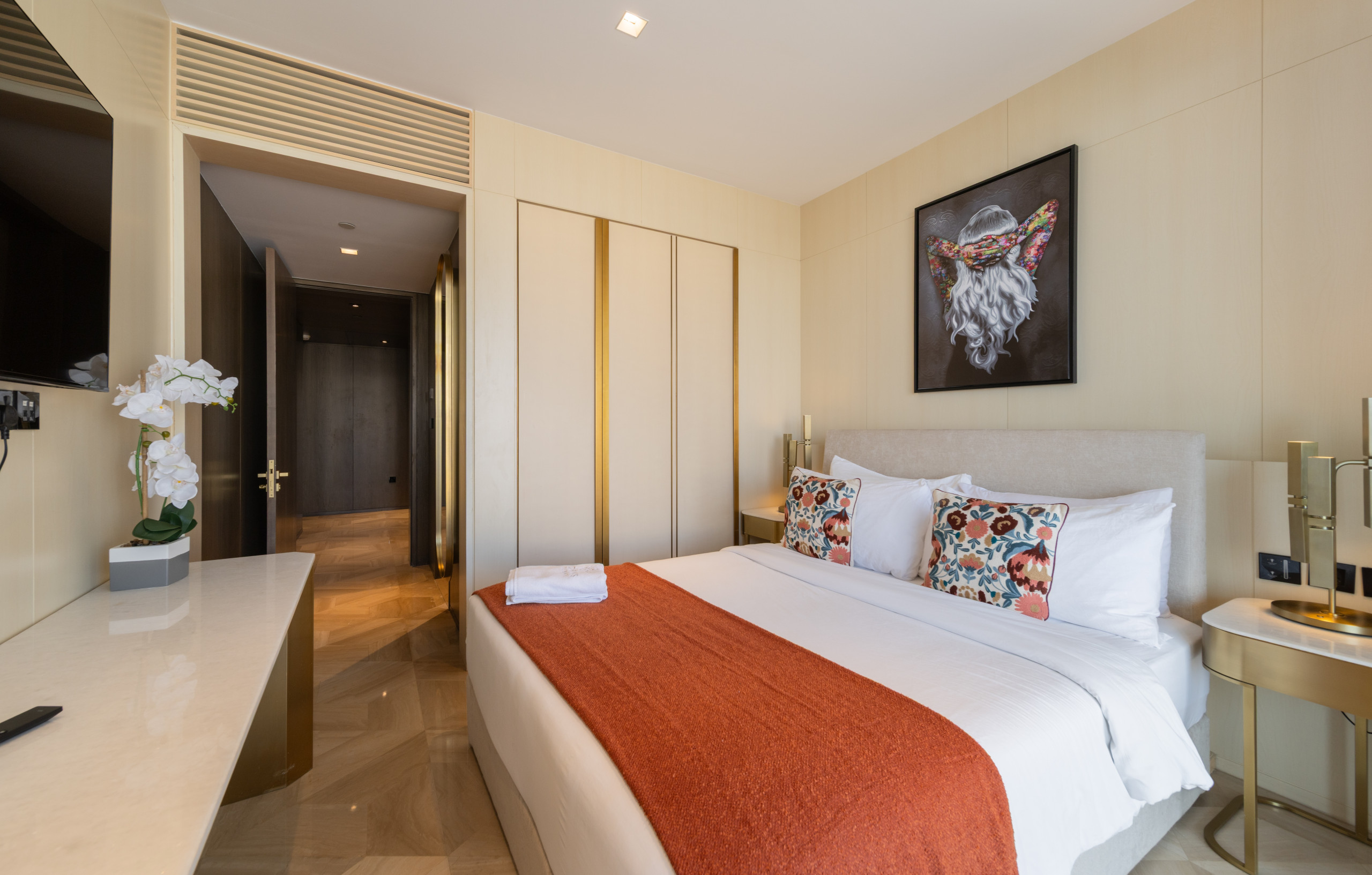 The elegant-styled master bedroom features a king size bed with two bedside tables and premium bedding for a sleep-filled night. The bedroom overlooks city views. You’ll have access to a built-in wardrobe.